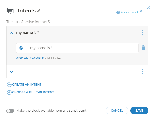 To edit the intent, click on the block. This will open the list of sample phrases the intent contains. If you use a built-in intent, it will be specified at the top of the block.