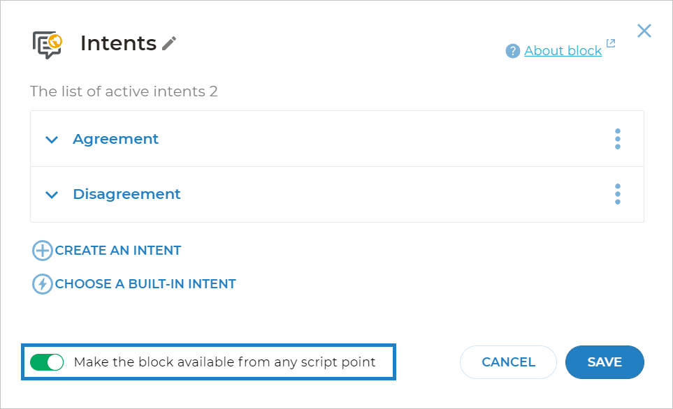 You can also use the built-in intents we have created for you. They cover the most widespread behavior patterns such as greeting, agreement, personal data provision, etc.