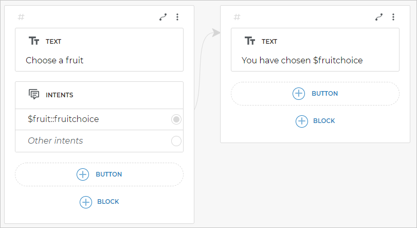 - First, you add the words clients can send as well as sample phrases and phrase templates to the Intents block.