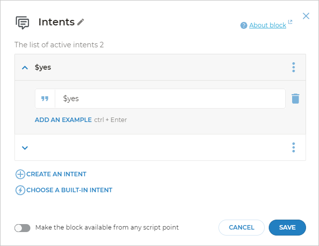 You can also use these patterns in your own intents by specifying them in sample phrases when editing an intent. You do not need to add templates from the patterns — it is enough to specify the pattern name in the Intents block as follows: