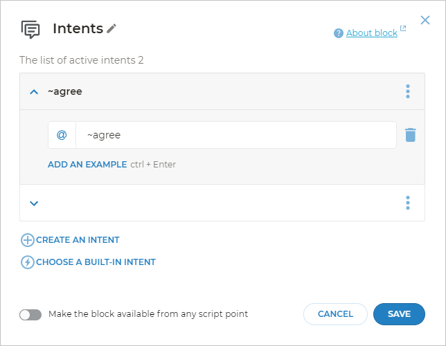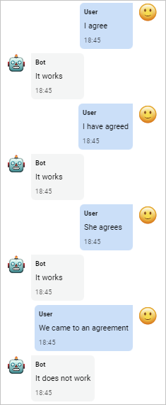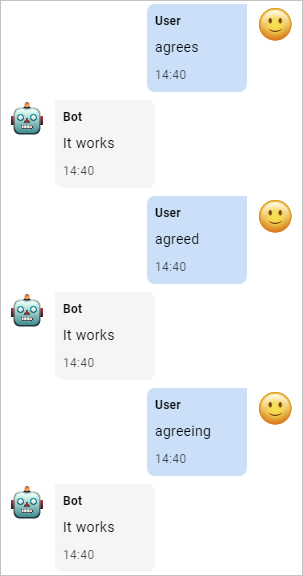 The template makes the bot recognize all forms of the “agree” verb, as well as two to three words before and after it.