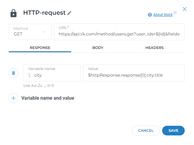 Since we previously got the user ID using the conditions block, our request contains the following value: user_ids=${id}, instead of {id}, the real VK user ID will be used.
