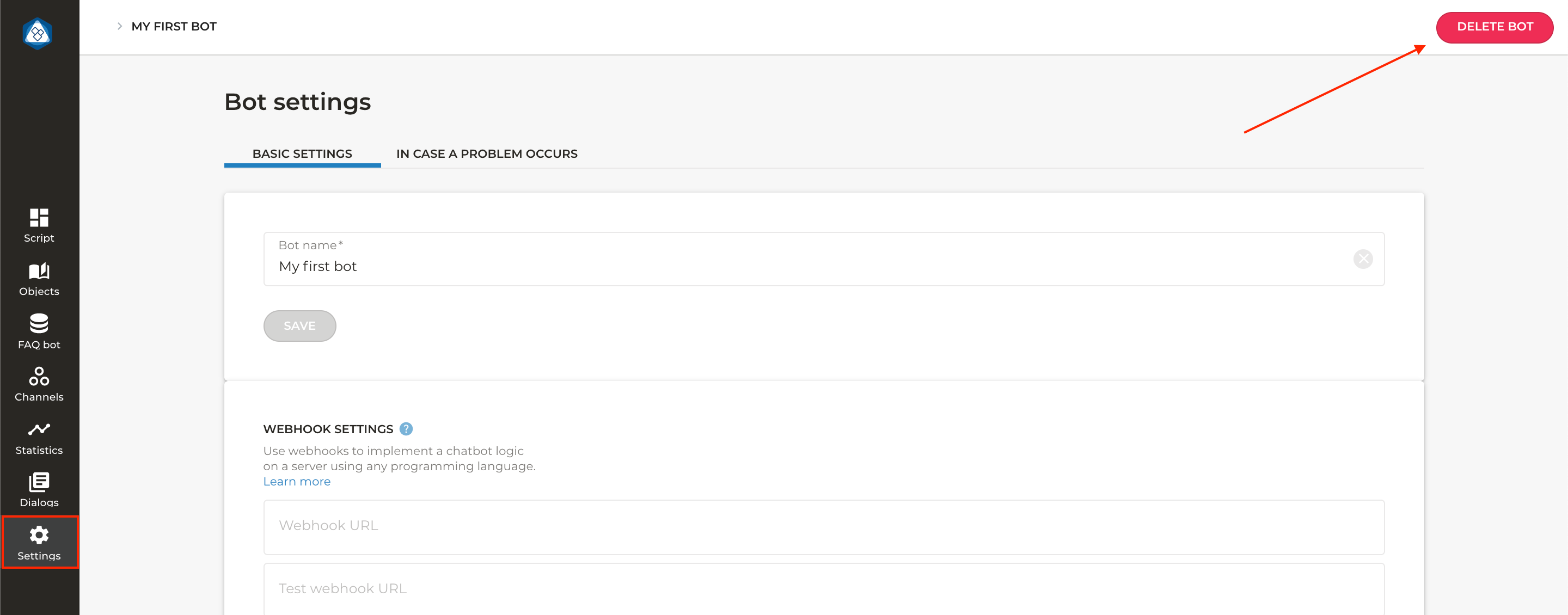 Click Delete bot in the top right corner