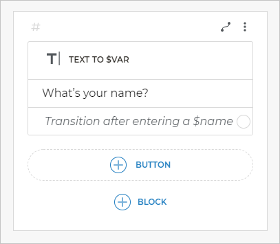 To do this, add a new screen with the text to $var block. You can find it in the More blocks submenu. This block uses the client’s answer to declare a new variable that can further be used in the script.