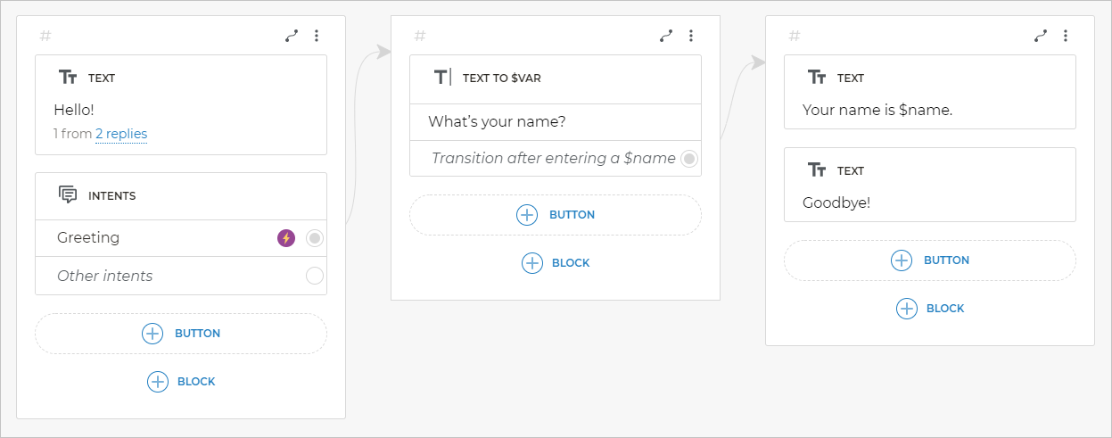 So as we do not want the bot to say anything else, you can add one more Text block saying “Goodbye!” to the final screen.