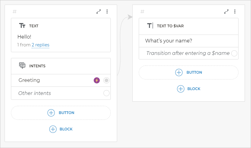 - Actions — bot’s reactions and actions, except messages. For example, transferring the dialog to an agent or ending the script.