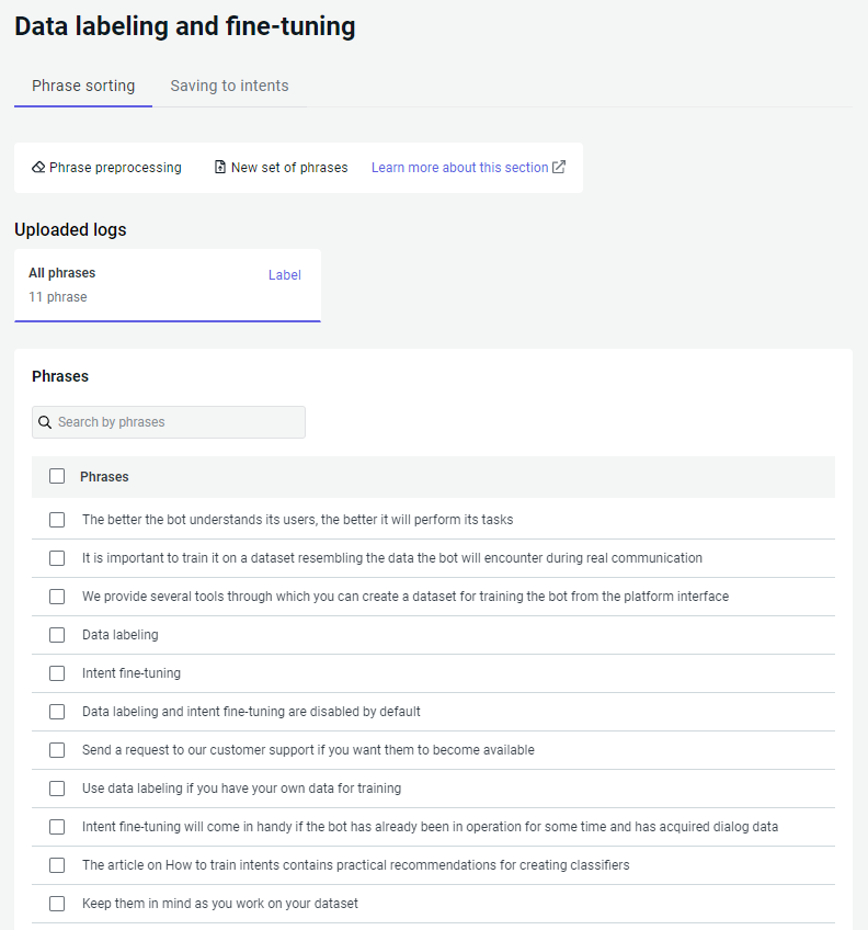 After you have labeled your dataset, sort phrases into intents.