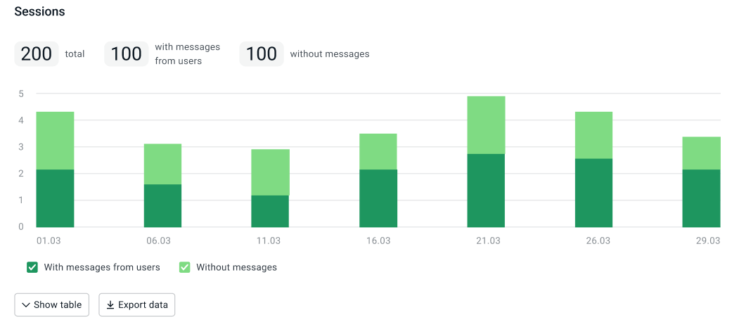 On the Activity tab, you have access to quantitative metrics: users, sessions, messages.
