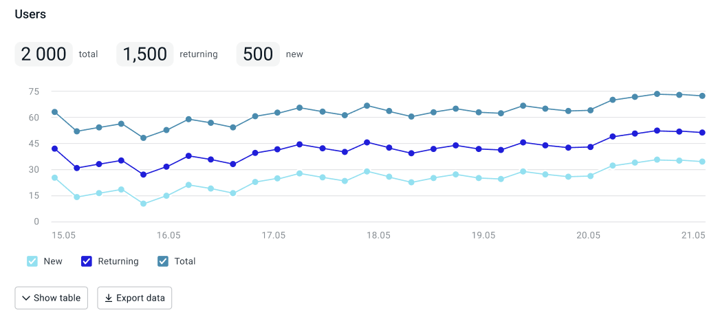 | Track audience growth since the start of the promotional campaign. | New and returning users. | Select the period that you need using a filter and evaluate the dynamics of changes in values. |