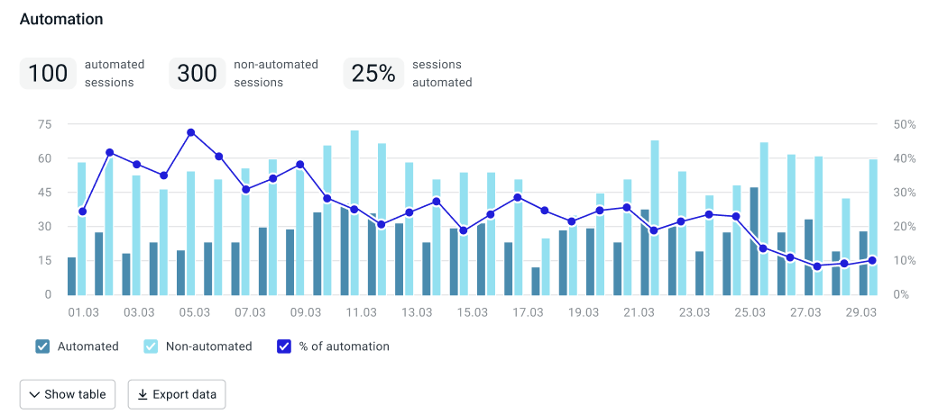 The Automation section displays session automation statistics. A session can be considered automated, for example, if the user’s request was resolved without agent assistance.