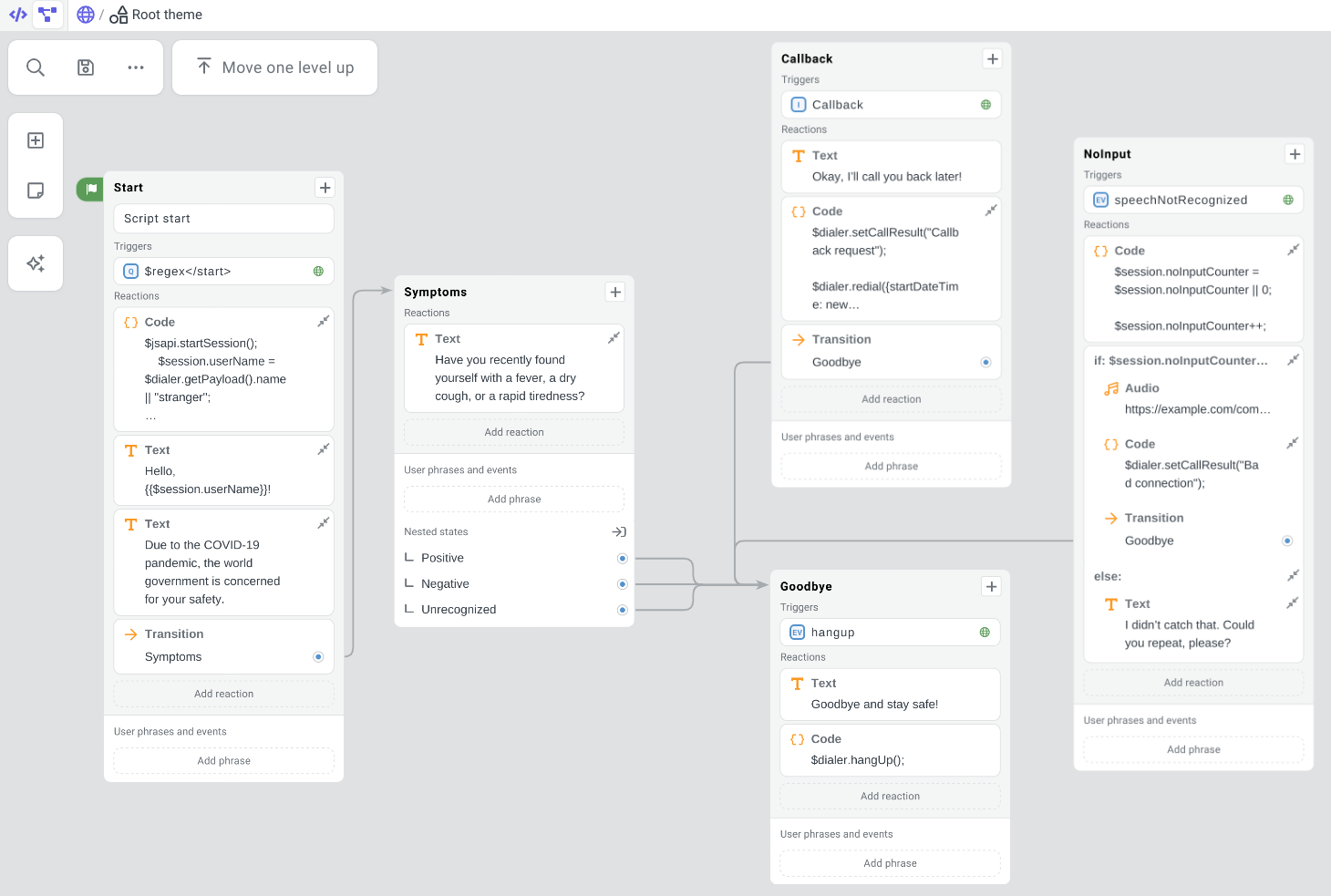 - Add some user phrases and events to connect your states with links by which the dialog will be able to hop from one state to another.