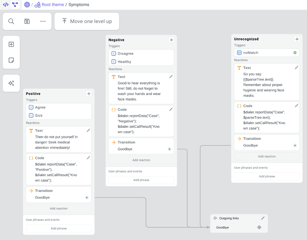During script development, some states can be nested into others. These states are logically dependent on their parent state: for example, the bot may switch to children states only from their parent but cannot do so from other places in the script.