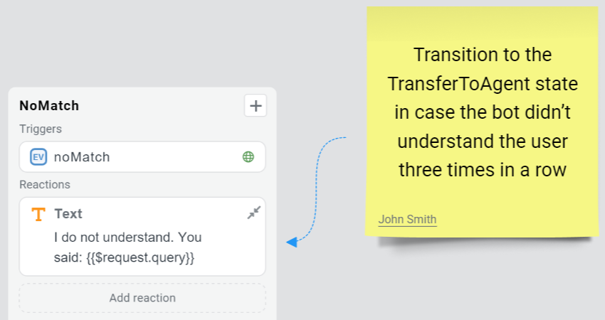 You can leave comments to the script using colored sticky notes. This is useful for collaborating on a project. For example, a conversational designer can document the business logic at a specific state in a comment for a developer.