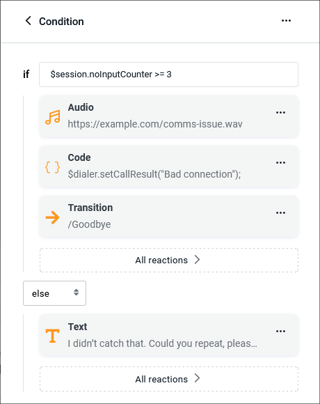 - Select Add else if you need to configure alternative reactions. They will be executed if the condition is false.