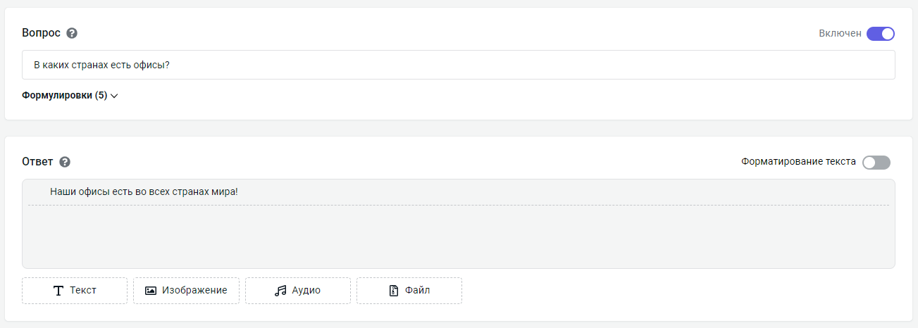 В базе знаний включен модуль FAQ.Контактная информация и задан ответ на вопрос В каких странах есть офисы?.