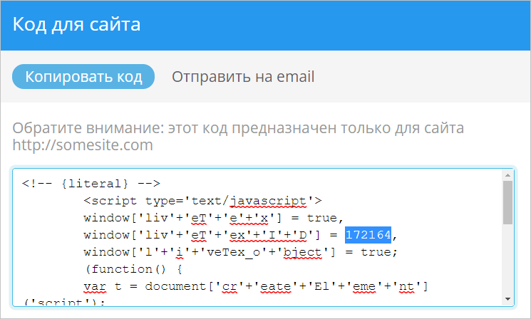 Если вы выбрали Сайт в качестве точки контакта, нажмите Код для сайта напротив нужной точки. Найдите в коде следующий параметр: