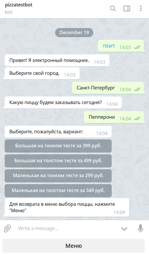 ChoosePizza— выбор пиццы из справочника.GetName— сохранение выбранного клиентом варианта.ChooseVariant— выбор вариантов приготовления пиццы.GetVariant— сохранение параметров для выбранной пиццы.ChooseQuantity— выбор количества пиццы для заказа.GetQuantity— сохранение введенного количества пиццы.