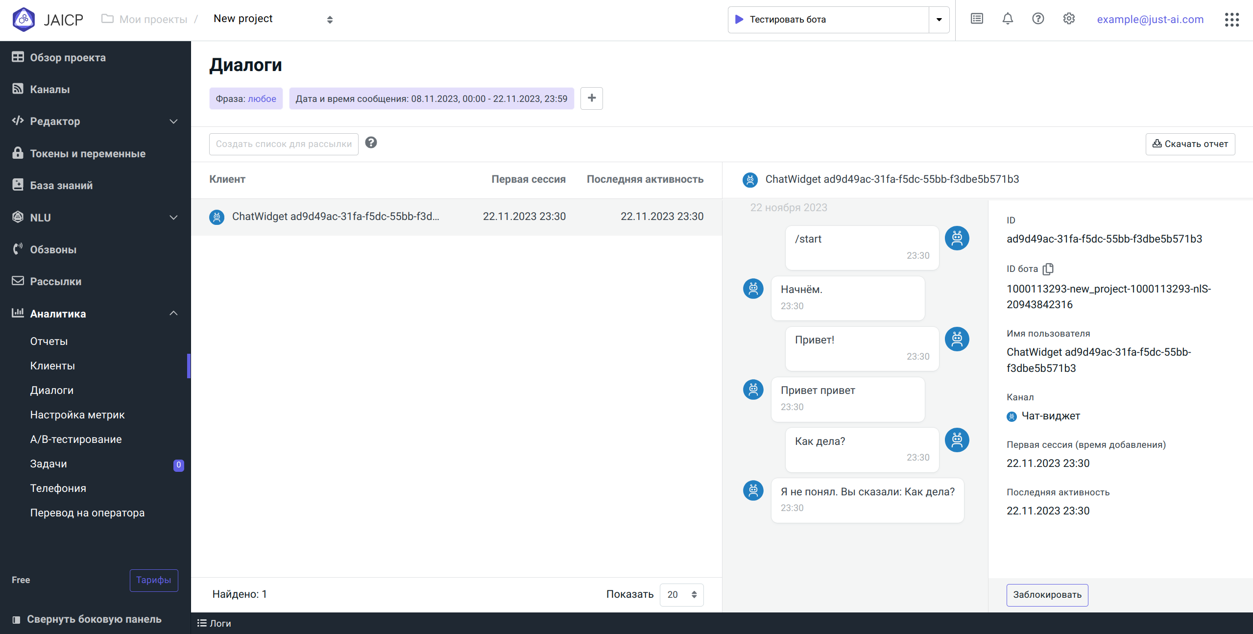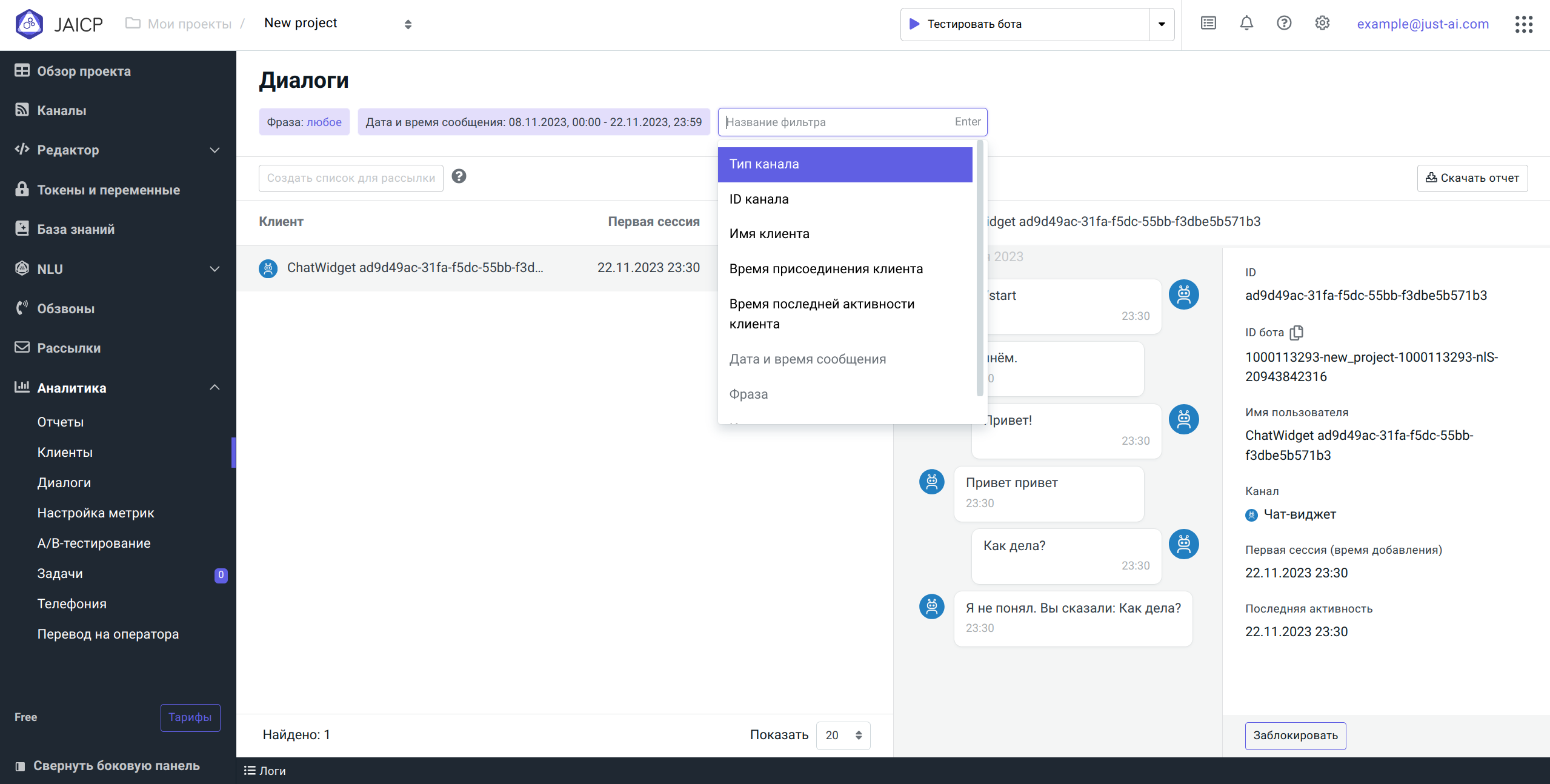 Платформа JAICP позволяет проследить за аналитикой чат-ботов для каждого подключенного канала. В разделе Аналитика вы найдете данные о клиентах, а также сможете понять их поведение в общении с чат-ботом. На основе полученных данных вам будет проще выявить недостатки или ошибки бота, оценить качество его ответов, а также определить задачи по повышению эффективности бота.