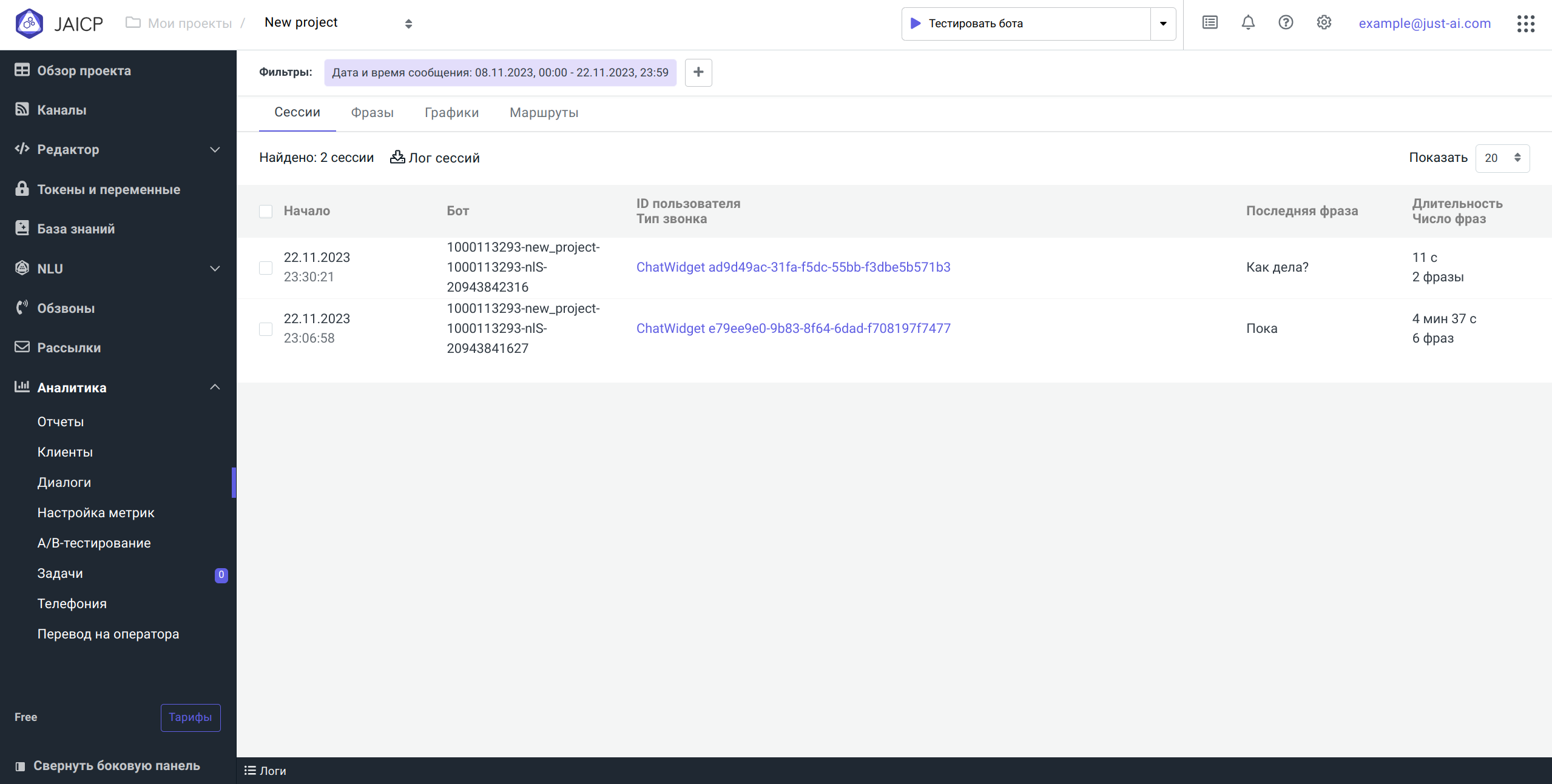 Во вкладке Аналитика > Диалоги отображаются все сессии и фразы клиентов бота.