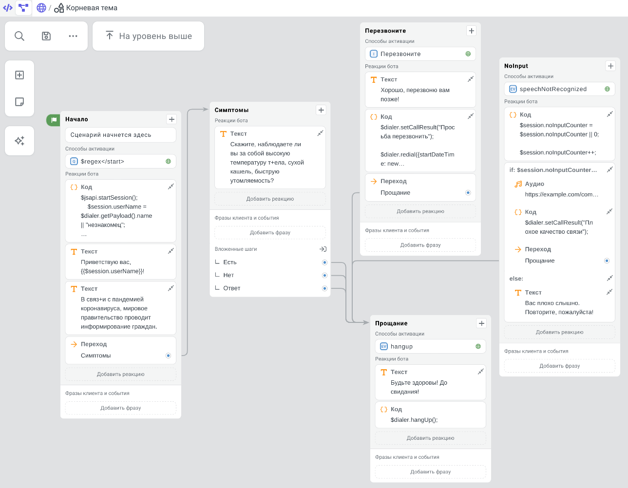 3. Добавьте фразы клиента и события, чтобы соединить шаги связями, по которым диалог сможет переходить из одного шага в другой.