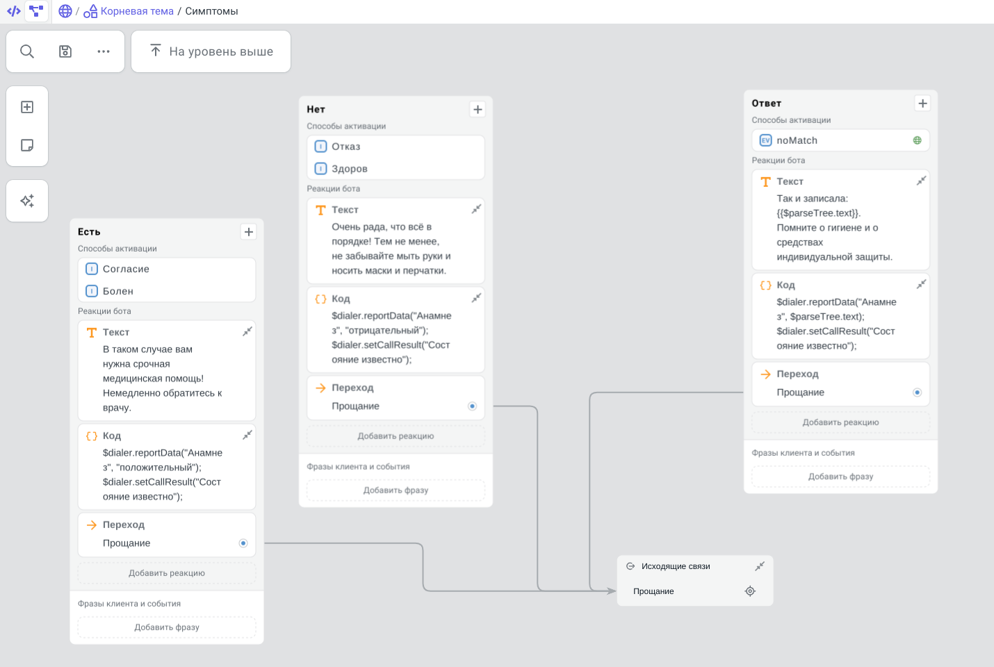 При разработке сценария одни шаги можно вкладывать в другие. Такие шаги логически подчинены своему родительскому шагу: например, бот может попасть в дочерние шаги только из родительского, а из других мест в сценарии не может.